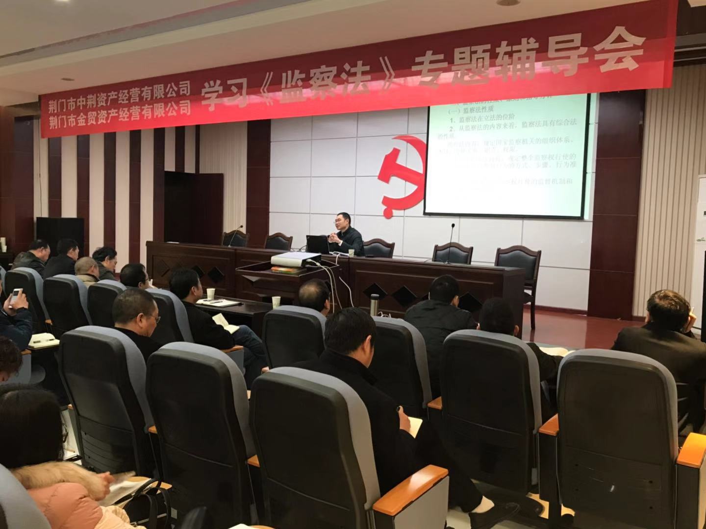 2018年12月5日上午,市中荊資產(chǎn)經(jīng)營有限公司、市金貿(mào)資產(chǎn)經(jīng)營有限公司在五樓會議室聯(lián)合舉辦了《中華人民共和國監(jiān)察法》專題輔導會,中荊投資控股集團有限公司領(lǐng)導及系統(tǒng)內(nèi)全體員工參加了輔導。會議由公司副總經(jīng)理梁世希同志主持,邀請了荊門黨校法學教授吳衛(wèi)東授課。