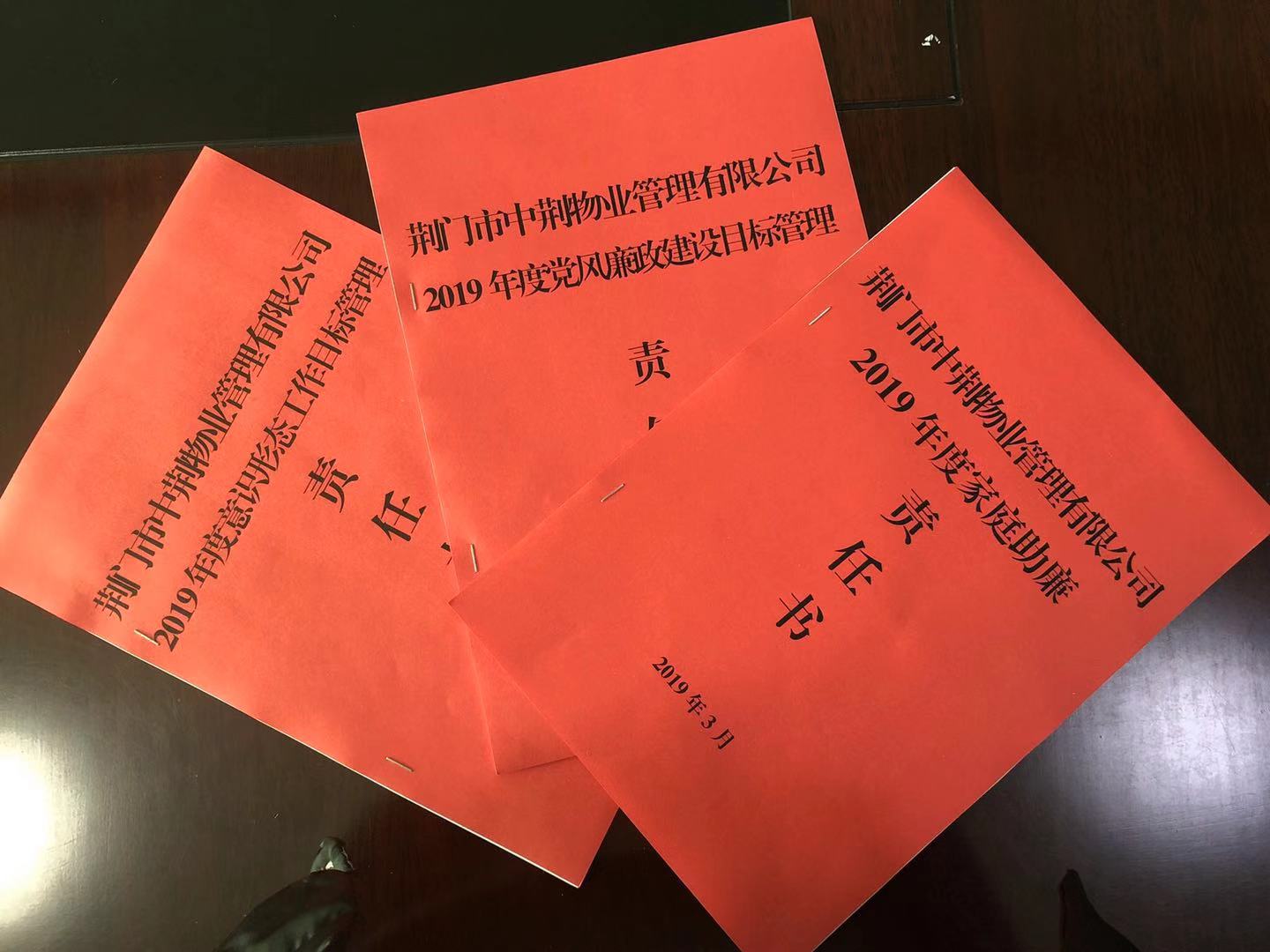 2019年3月14日,市中荊物業(yè)管理有限公司黨總支與公司各黨支部、部室、領(lǐng)導(dǎo)成員簽訂了《2019年度黨風(fēng)廉政建設(shè)目標(biāo)管理責(zé)任書》、《2019年度意識形態(tài)責(zé)任書》、《2019年度家庭助廉責(zé)任書》,各類責(zé)任書的簽訂,進(jìn)一步明確了各項(xiàng)工作中的職責(zé),把責(zé)任扛在肩上。為我公司2019年各類工作任務(wù)的落實(shí)起到了保障作用。
